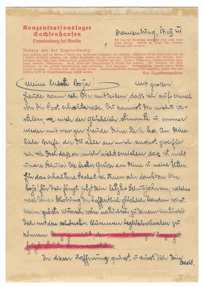 A letter sent from Sachsenhausen concentration camp (near Berlin), on official paper and dated 17 August 1941.